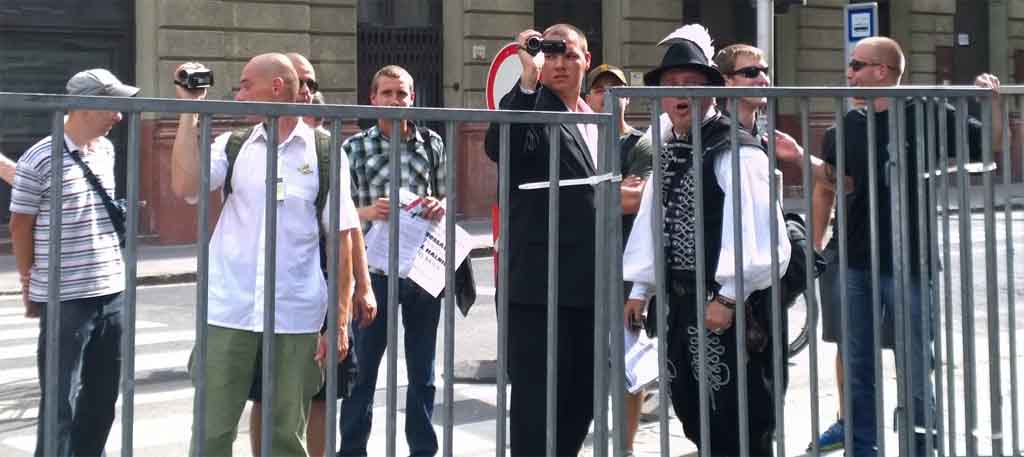 Schon am Ausgang der Metrostation beobachte ich eine äußerst skurrile Begebenheit: Pride-Organisatoren stehen dort mit Hinweisschildern und leiten Sympathisanten und Teilnehmer durch Absperrungen in eine Richtung, Gegendemonstranten in die andere. Je nach Gesinnung findet man sich in seinem Demonstrationsbereich wieder. Plötzlich entsteht ein wildes Durcheinander, als zehn schwarzgekleidete, glatzköpfige Männer – offensichtlich Gegendemonstranten – versuchen zum offiziellen Demonstrationszug zu gelangen. Einer von ihnen trägt einen auffälligen Hut mit langer Kielfeder. Er ist laut, schreit und flucht. Man spürt den Hass. So viel Energie gegen etwas, was doch eigentlich Niemandem schadet, denke ich traurig. Der Mann mit dem Hut ist der Bürgermeister von Érpatak, einem kleinen Dorf in der nordostungarischen Provinz. Er gehört zur Jobbik, der rechtextremistischen Partei Ungarns. Unterstützt wird sein Ausbruch von 5-6 jungen Männern, die mit ihren schwulenfeindlichen Transparenten, die Ausschließlichkeit der Heterofamilie propagieren. „100 Prozent von Gott genehmigt“, lautet ihre homophobe Parole. So viel Hass, Wut und Aggressivität habe ich selten erlebt. Irgendwie gelingt es Polizei und Organisatoren diesen Tumult aufzulösen und die wütenden Gegendemonstranten in die ihnen zugewiesen Bereiche zu bugsieren, wo sie mit ihren Hassparolen unter sich bleiben.
