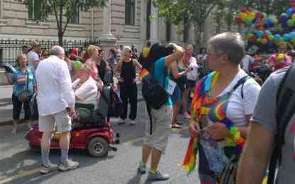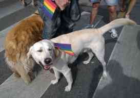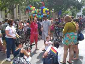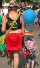 Hinter der Absperrung empfängt mich eine andere Welt: Musik, gute Laune, es wird viel gelacht. Die Angst, die ich vor der Absperrung spürte, ist verflogen. Ich sehe junge und alte Pärchen, Heteros und Homos zusammen. Familien mit Kinder und Hund, viele halten winzige Pride-Fähnchen in der Hand. Sympathisanten und Teilnehmer verhalten sich sehr zurückhaltend, dezent: ich sehe nur einige halbnackte Männer, oder (nach ungarischen Maßstäben) extrem gekleidete Männer, Frauen und Transvestiten. Was mir auffällt, sind die vielen Kinderwagen und Hunde. Eine echt familiäre Atmosphäre, denke ich. Fast wie in „normalen“ Städten wie Köln, London oder Paris. Nur, dass es dort keine Absperrungen gibt.