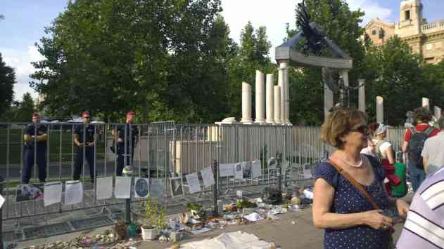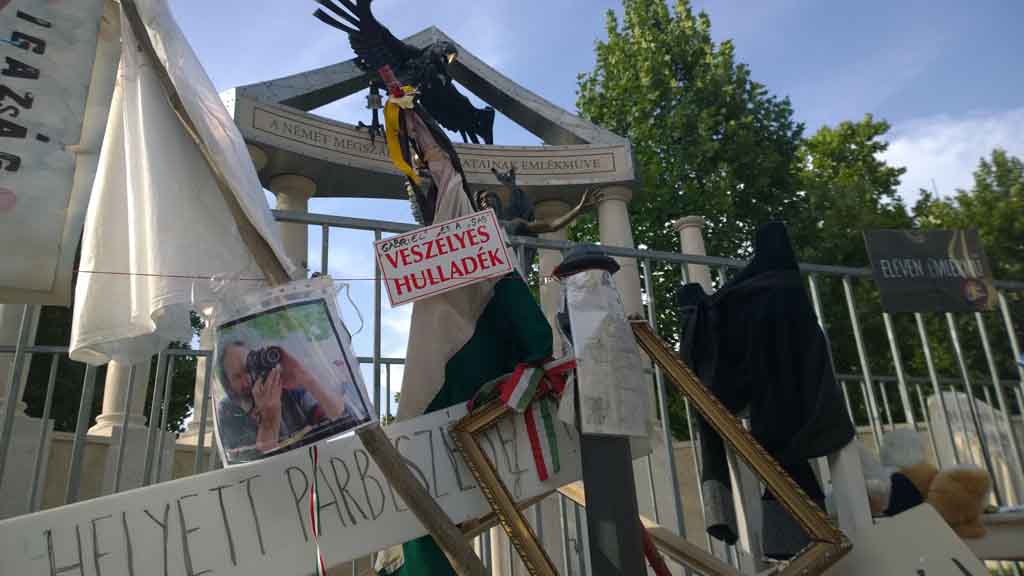 Das monumentale Denkmal soll an die deutsche Besatzung Ungarns 1944 erinnern. Es sendet aber eine umstrittene Botschaft: Ungarn, von Erzengel Gabriel verkörpert, wird als Opfer eines angreifenden deutschen Reichsadlers dargestellt. Kritiker sehen darin eine Geschichtsfälschung und den Versuch der rechtskonservativen Regierung Orban, Ungarn als Opfer der deutschen Besatzung im zweiten Weltkrieg darzustellen und gleichzeitig die Mitverantwortung Ungarns am Holocaust auszublenden.