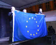 Auf der Bühne wird die EU-Fahne hochgehalten. –