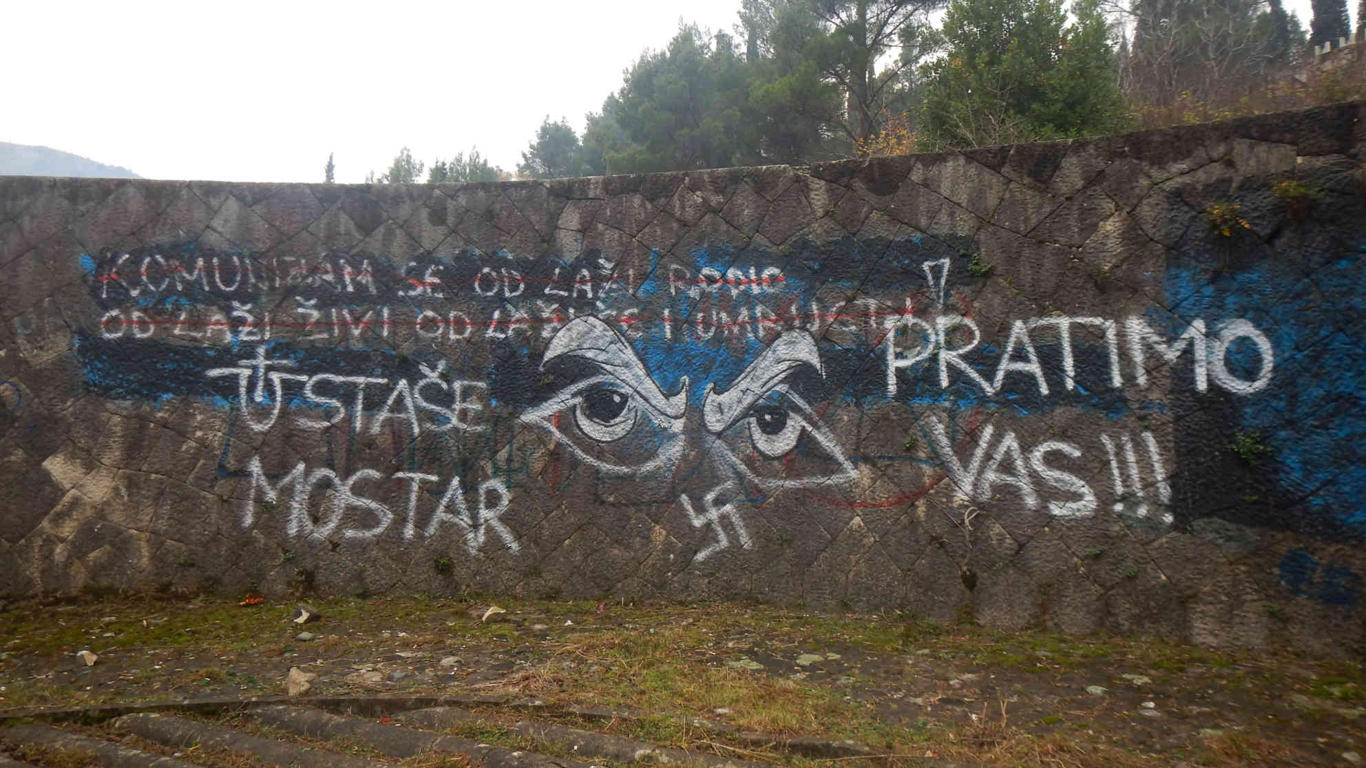 Würde der berühmte Architekt Bogdan Bogdanovic noch leben, er wäre wohl entsetzt zu sehen, wie es auf dem Partisanenfriedhof in Mostar aussieht, den er 1965 entworfen hat. Der Friedhof ist gleichzeitig eine Gedenkstätte und diese ist weit über Mostar hinaus bekannt. Doch das Gelände ist über und über beschmiert. Mit Hakenkreuzen, SS Zeichen oder Symbolen des faschistisch-kroatischen Ustascha Staates, der zwischen 1941-45 auf Hitlers Gnaden existierte. Auch rund 160 Gräber der dort beerdigten Tito Partisanen des Zweiten Weltkriegs wurden geschändet. Die hellen Steine, auf denen die Namen der Toten stehen, wurden mit roher Gewalt herausgerissen und zerstört. Dazu ist mindestens eine Spitzhacke oder ein großer Hammer nötig, denn die Steine sind circa 15 Zentimeter dick. Das macht großen Lärm sollte man meinen, und müsste regelmäßig die Polizei auf den Plan rufen. Doch diese ermittelt nicht und so ist unklar, wer die Täter sind. Da der Partisanenfriedhof eine nationale Gedenkstätte ist und damit der Föderation Bosnien-Herzegowina untersteht, fühlt sich die Stadt nicht zuständig. Stattdessen kümmert sich eine private Initiative der Zivilgesellschaft um die Restaurierung und Sicherheit der Gedenkstätte. Sie hat Spenden gesammelt und vor wenigen Tagen mit dem Wiederaufbau des berühmten Partisanenfriedhofs begonnen. Dieser muss teilweise unter Polizeischutz stattfinden. In der Initiative für Wiederaufbau des Partisanenfriedhofs engagieren sich Menschen aus ganz Mostar gemeinsam. Doch ansonsten ist Mostar seit dem Bosnienkrieg de facto eine geteilte Stadt, in der sich Bosniaken und Kroaten häufig feindselig gegenüberstehen. Wer die kroatisch dominierte Lesart der nationalistischen Eliten offen in Frage stellt, riskiert Anfeindungen bis hin zur Gewalt. Als Eldina Jasarevic und Andrea Beer den Partisanenfriedhof besuchen und Fotos machen, taucht wie aus dem Nichts sofort ein „Begleiter“ auf, der sie beobachtet.