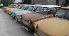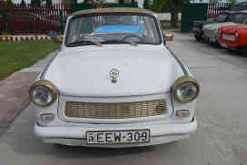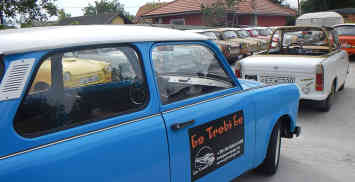 Die Firmenzentrale liegt in der Nähe von Budapest, nur wenige Kilometer von der Stadtgrenze entfernt. Ein ordentliches Einfamilienhaus, aber der Hof…Der steht voller farbiger Trabis. 28 Kleinautos vermietet Tamas Feher derzeit. Und es gibt noch mehr als 20 für andere Bedürfnisse.  Der gut gelaunte Besitzer begrüßt  mich, und schon am Tor beginnt er mit den Geschichten. Man merkt sofort, dass er in Trabis verliebt ist, er weiß alles über die PVC-Jaguare. „Natürlich war auch mein erstes Auto ein Trabant“, erzählt Tamas Feher. Das änderte sich mit der Wende. „Alle wollten West-Autos haben“, sagt er, „der Trabi war den Leuten peinlich“. Erst nach 2000 wurde die Marke wieder interessant.