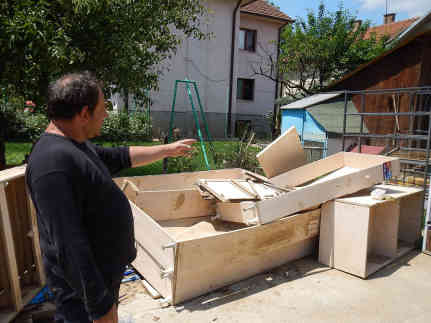 Obrenovac – Der Ladenbesitzer Aleksandar Zivkovic vor den zerstörten Möbeln seines Geschäfts. – Foto: BR | Dejan Stefanovic